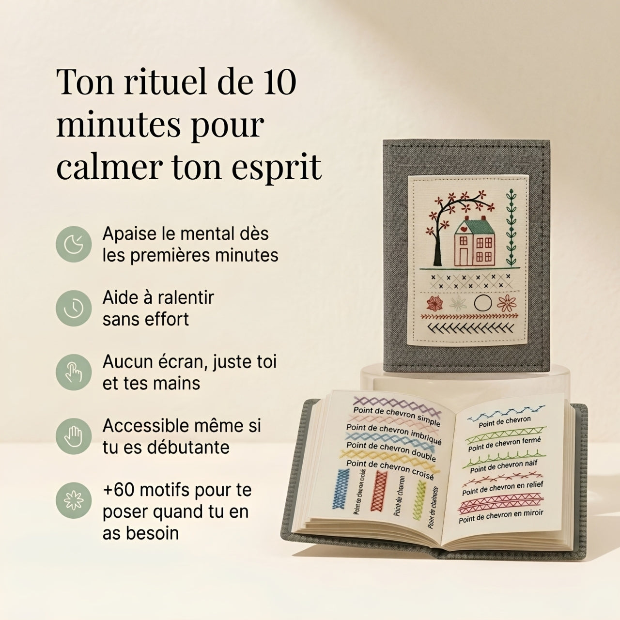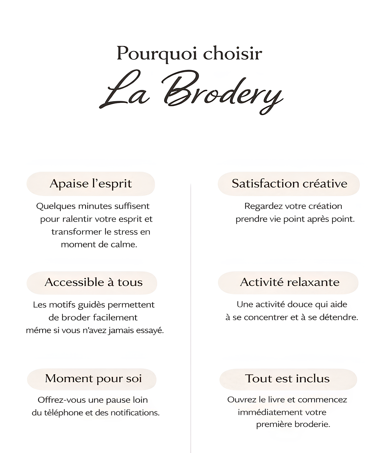 Sylvie Z 01/2026Acheteur vérifiéCe petit livre, c’est mon remède contre l’anxiété. Quand je suis submergée, je m’assois et je commence à broder, et mon cerveau ralentit immédiatement