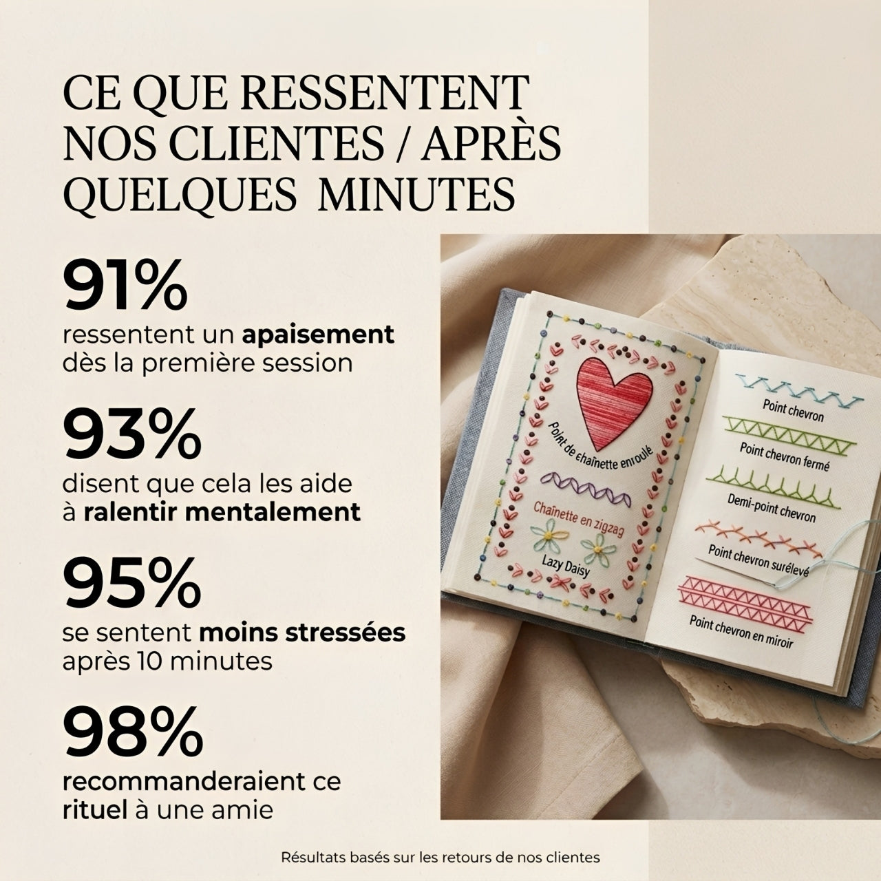 Tu ouvres le kit, tu choisis un motif, tu fais quelques points… et ton esprit se pose. C’est fluide, accessible, et ça t’offre ce petit moment de calme qui fait du bien, même si tu pars de zéro.
